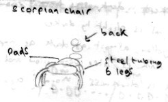I've been having some design ideas over the past two days. The picture shows the sketch of a chair design based on a scorpion. There are six tubular steel legs and segmented elliptical cushions that curve upwards to form the back of the chair in emulation of a scorpion's tail.